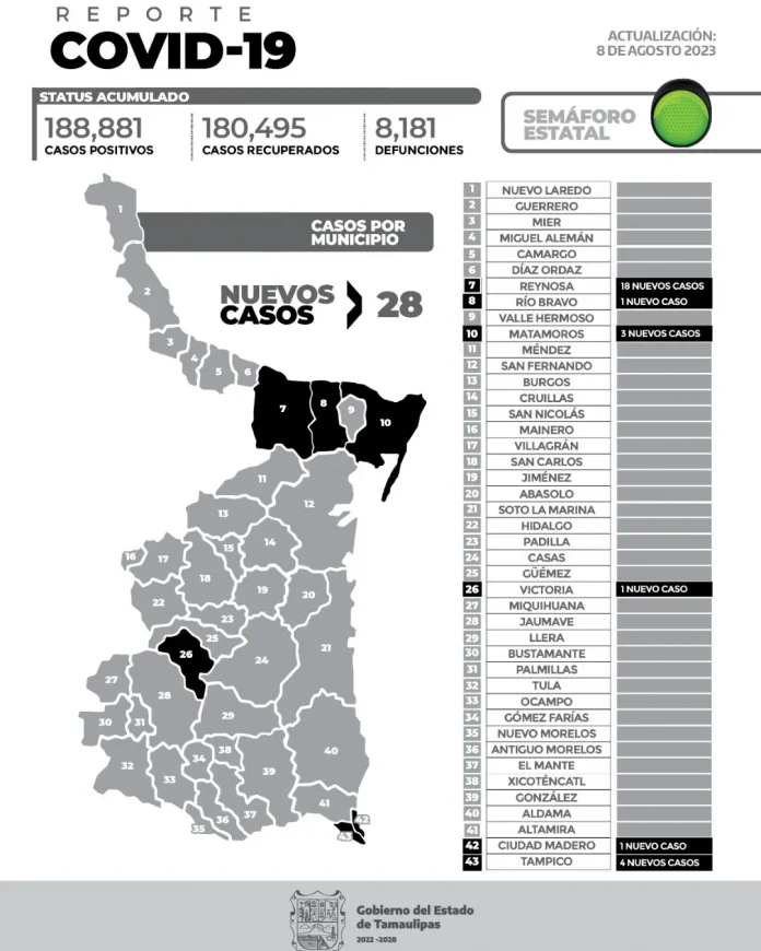 CIUDAD VICTORIA, TAMAULIPAS.–El reporte oficial de casos de COVID-19 de este martes en la entidad registra 28nuevos pacientes y sin fallecimientos.