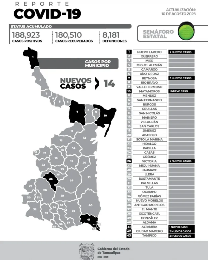 Desde el inicio de la pandemia Tamaulipas suma 188 mil 923 pacientes y 8 mil 181 defunciones.
