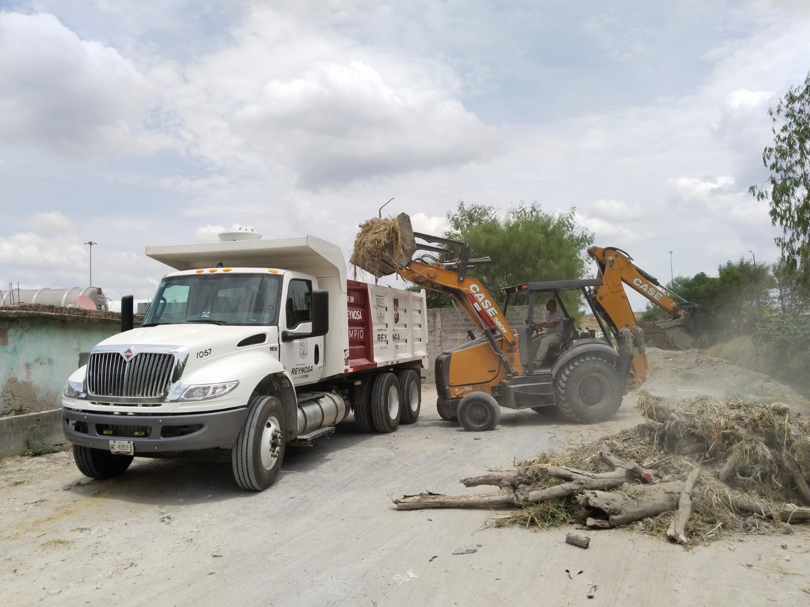 Por parte de Servicios Públicos Primarios se continúa desazolvando el dren Reynosa a la altura de la colonia Riberas del Bosque y también realiza el retiro de basura del dren en la colonia López Portillo, donde previamente se efectuó su saneamiento.