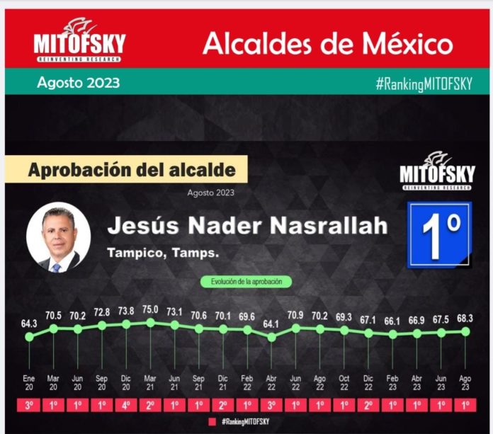 Tampico,Tamaulipas..-Con una aprobación ciudadana de 68.3%, el alcalde Chucho Nader, se ubicó otra vez en el primer lugar del ranking de 150 presidentas y presidentes municipales mejor evaluados del país, de acuerdo a una encuesta realizada por la empresa Mitofsky.