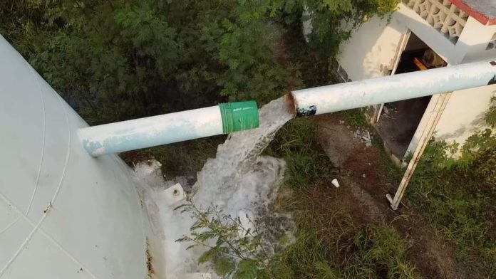 Personal del área técnica y operativa del organismo, lleva a cabo trabajos de saneamiento y desinfección de dicha cisterna a fin de mantener en perfectas condiciones el vital líquido que se les distribuye a los usuarios.