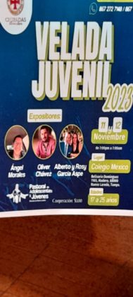 La Velada Juvenil se trata de una noche convocada para que asistan jóvenes entre 16 y 25 años de edad, para que pasen momentos de reflexión, de convivencia y fraternidad, para mantener los valores del Evangelio y darles herramientas para el fortalecimiento de los valores humanos.