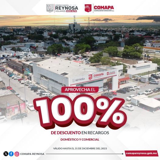 La Comisión Municipal de Agua Potable y Alcantarillado de Reynosa invita a los usuarios a regularizar su situación con el organismo aprovechando el 100% de descuento en recargos por adeudo al pagar el recibo en una sola exhibición.