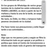 Trascendió en redes sociales, y mediante los grupos de WhatsApp de varios grupos de taxistas de la ciudad, les están ordenando que PAREN LABORES, es decir a partir de las 8 de la mañana y hasta la una de la tarde, se suspende actividades…