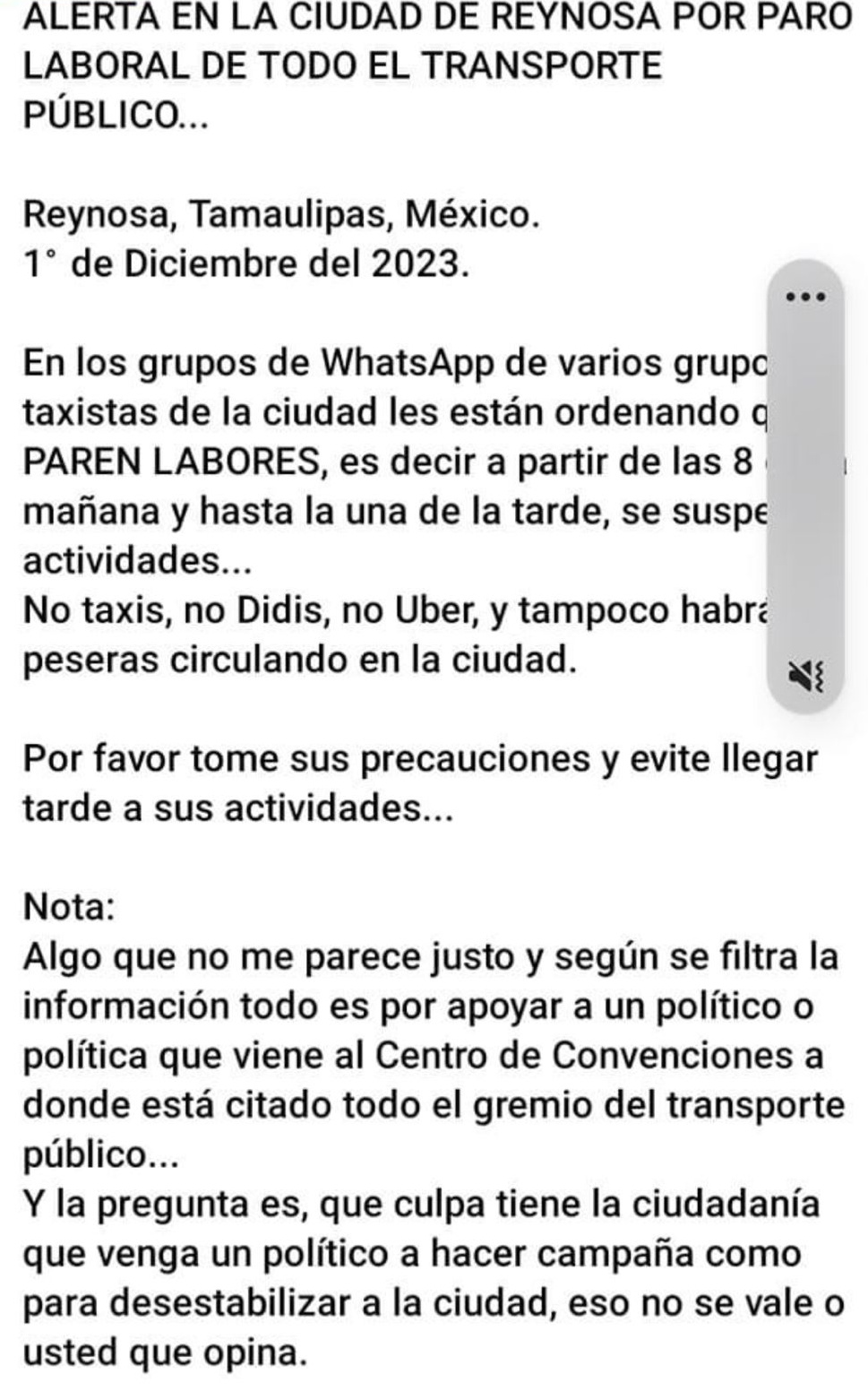 Alertan en Reynosa por paro de labores en general del Transporte Público Urbano