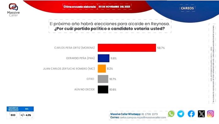 Reynosa, Tamaulipas.-De nueva cuenta el actual alcalde de Reynosa, Carlos Víctor Peña Ortiz, destaca en los perfiles de ser el candidato más fuerte para reelegirse en el cargo en las próximas elecciones del 2024, de acuerdo a una encuesta realizada por la empresa Massive Caller.