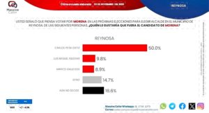 Por otra parte el estudio de la empresa Massive Caller, reveló que el alcalde morenista de Reynosa es el favorito de su partido Morena para ser postulado nuevamente con el 50 por ciento de las menciones, seguido por dos aspirantes más que no alcanzan el 10 por ciento.