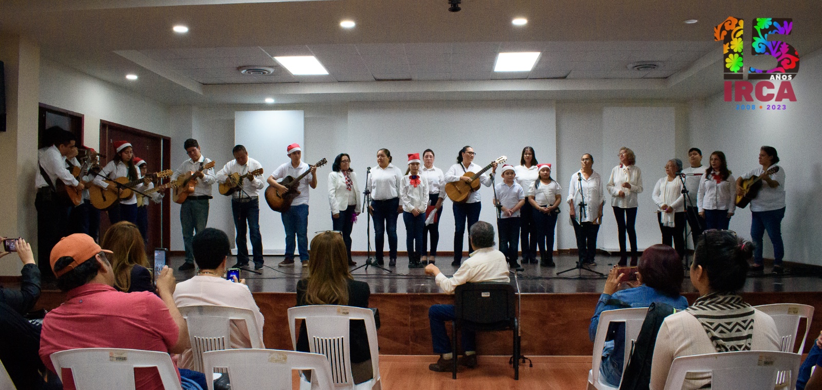 El escenario del Auditorio 1 del Centro de Artes en IRCA Longoria recibió a familiares y amigos que se dieron cita para escuchar un repertorio instrumental con tema de época decembrina, Popurrí Navideño, que ofrecieron los alumnos del Taller de Guitarra bajo la dirección del maestro Bizantino Hernández. Por su parte la Rondalla Voces y Cuerdas del IRCA, dirigidos por los maestros Ignacio Ortiz, Aidée Guzmán y Miguel Ángel Ortiz, abrieron su presentación con la canción Alma Llanera para continuar con tres canciones de autoría del maestro Nacho Ortiz y villancicos con los que dieron fin a este concierto.