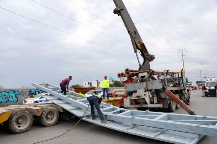 A fin de evitar el riesgo a los conductores que transitan por la carretera a San Fernando, a la altura del fraccionamiento Terranova, la Coordinación General de Servicios Públicos Primarios realizó maniobras para retirar una gran estructura metálica que fue dañada por un automovilista.