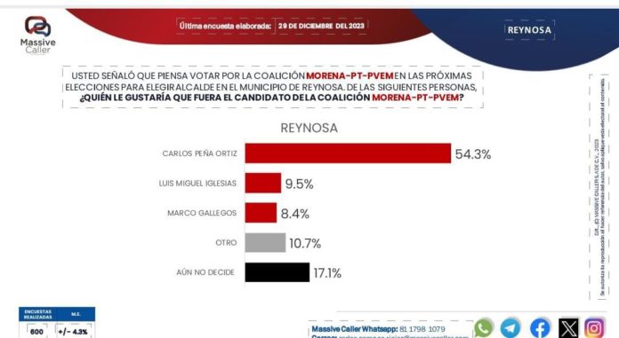 Los reynosenses dieron esta respuesta a: ¿Por cuál partido político o candidato votaría usted? Confirmando con el 54.3% que es él quien tiene segura la reelección por la Coalición MORENA-PT-PVEM, sobre apenas el 9.5% y 8.4% de los aspirantes que le siguen, así lo revela Massive Caller en su encuesta del 29 de diciembre.
