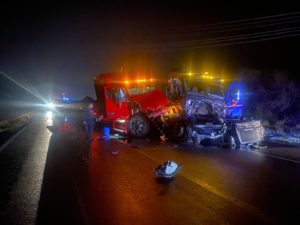 Personal de Apoyo Carretero perteneciente a Estación Segura El Barretal coadyuva en las labores de auxilio vial y brinda seguridad perimetral tras el impacto entre dos unidades pesadas registrado cerca del ejido Santa Engracia.