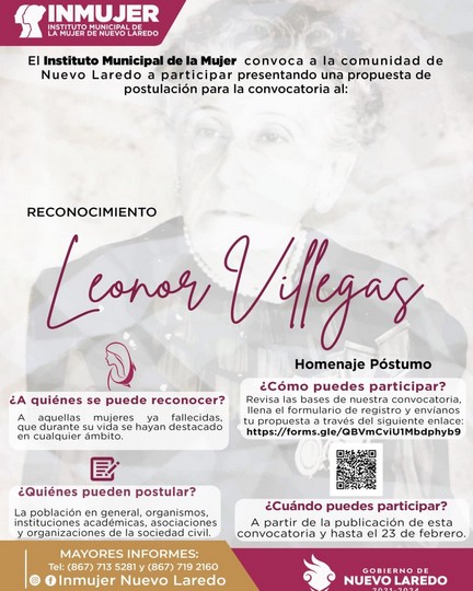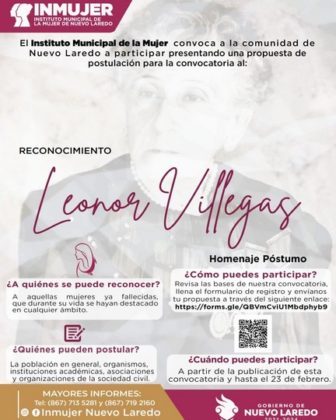 Nuevo Laredo, Tamaulipas.-Con el objetivo de reconocer la labor de mujeres destacadas de la ciudad, el Instituto Municipal de la Mujer (Inmujer) busca el reconocimiento a su legado para visibilizar el trabajo que han realizado y que ya forman parte de la historia de Nuevo Laredo, para lo cual se emite la convocatoria ‘Leonor Villegas’ en homenaje póstumo.