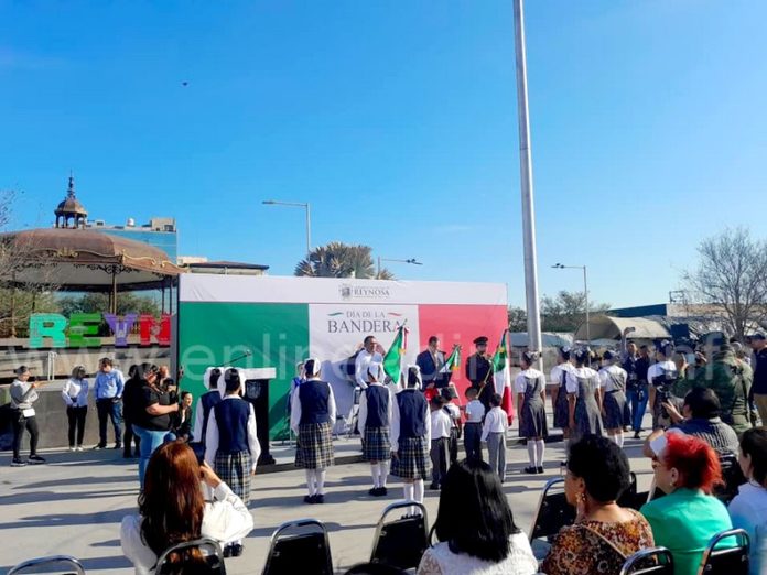 Reynosa, Tamaulipas.-Autoridades Municipales abanderaron a alumnos de escuelas públicas y privadas, además conmemoraron la celebración del día de la bandera.