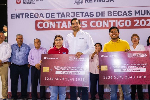 “Ustedes han tenido la fortuna de seguir estudiando en la Universidad y son ejemplo para muchos jóvenes reynosenses de las siguientes generaciones; invitamos a quienes van a terminar a que estén pendientes de las Becas de Titulación para que se beneficien también de este apoyo”, dijo el Presidente en la primera entrega de tarjetas para universitarios.