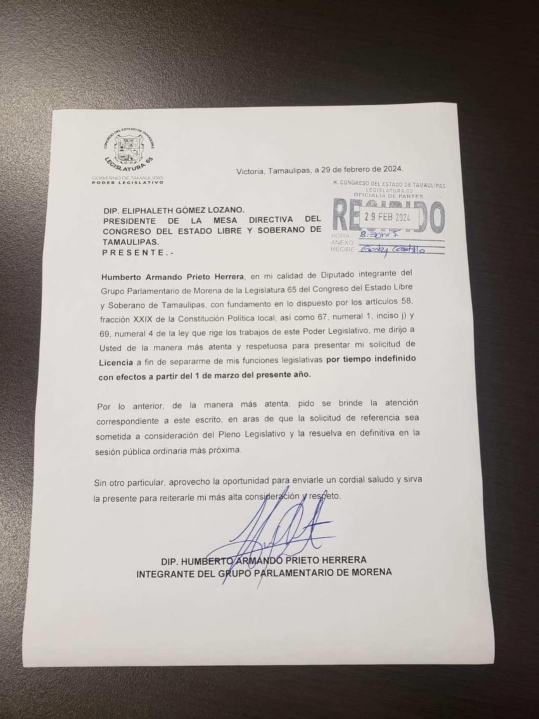 Reynosa, Tamaulipas.-El Diputado Local, Humberto Prieto Herrera, solicitó licencia para separarse del cargo por tiempo indefinido, y estar listo para lo que su partido MORENA designe.