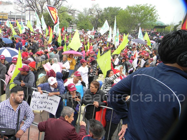 “Pues nos vamos a subir al tren de Nuevo Laredo porque vamos a hacer un tren desde México, San Luis Potosí, Monterrey y Laredo”, les dijo, lo que provocó vítores y aplausos acompañados del ondeo de decenas de mantas de los partidos Morena, Verde y del Trabajo al son de las manos de los miles de simpatizantes que llenaron esta importante plaza.