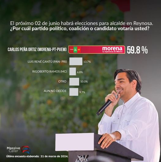 El candidato de la coalición MORENA-PT-PVEM a la presidencia municipal, Carlos Peña Ortiz domina la escena electoral de Reynosa, al recibir un determinante apoyo del 59.8% de preferencia electoral, de acuerdo a la opinión ciudadana, revelada en un ejercicio de consulta este 21 de marzo.