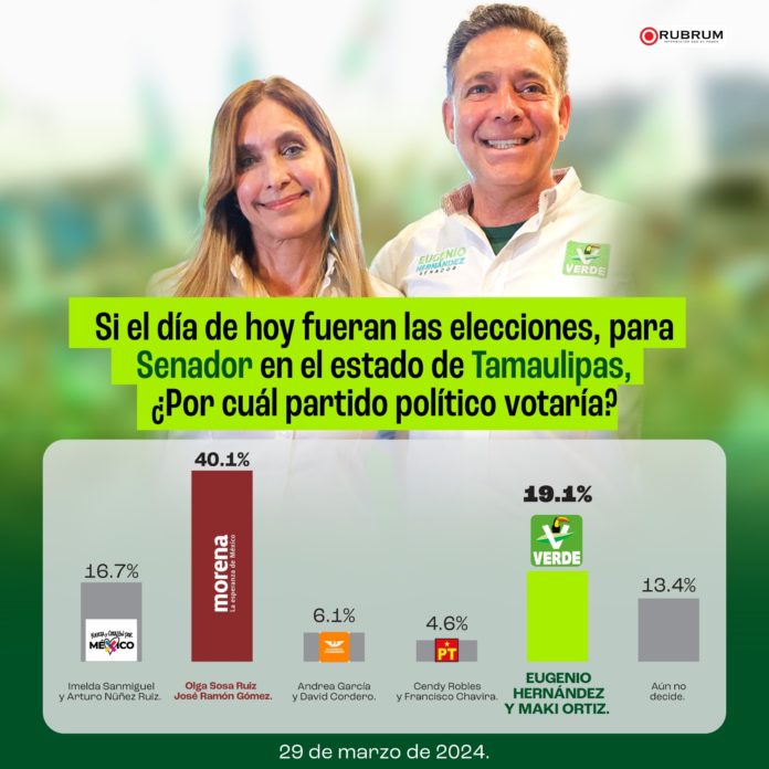 La fórmula del Partido Verde al Senado de la República, que integran Maki Esther Ortiz Domínguez y Eugenio Hernández Flores se instaló en segundo lugar de la preferencia electoral en Tamaulipas, con un 19.1% de acuerdo al sondeo realizado por la empresa RUBRUM este 29 de marzo.