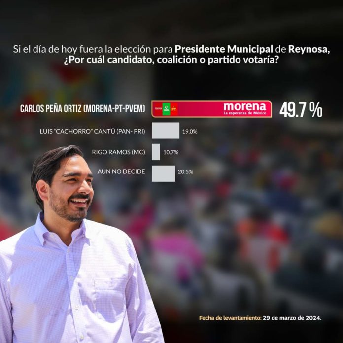 Reynosa, Tamaulipas.-Los más recientes sondeos electorales indican que Carlos Peña Ortiz, actual alcalde de la ciudad, está consolidando su posición como el principal candidato en camino a la reelección. Según los datos recabados por la encuestadora RUBRUM el 29 de marzo, Peña Ortiz, representando a la coalición MORENA-PT-PVEM, ha alcanzado un sólido 49.7% de preferencias electorales.