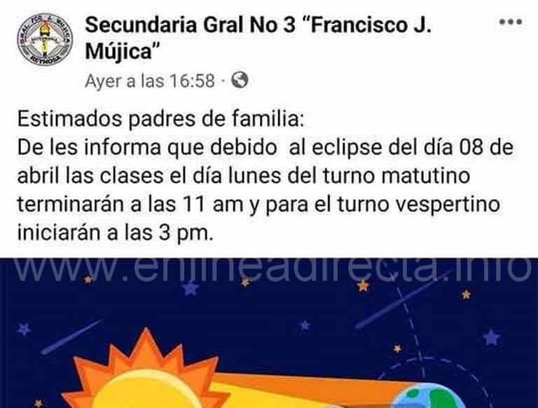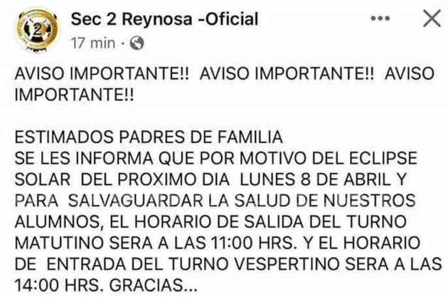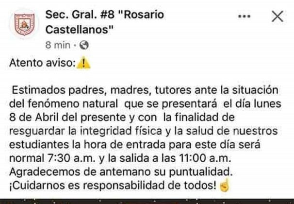 De acuerdo con los comunicados que dieron a conocer señalaron que de acuerdo con el fenómeno natural es decir el eclipse solar, y a fin de prevenir situaciones con los alumnos informaron que la entrada a los alumnos es horario normal y la salida a las 11 de la mañana.