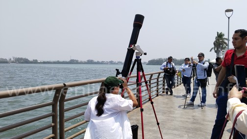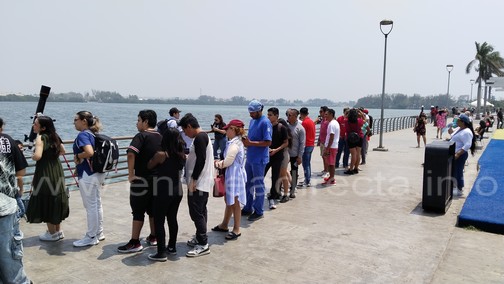 Tampico, Tamaulipas.-Al registrarse hoy el eclipse total de sol, el cual observó en varias partes del país, y aunque en esta zona no se obscureció, solo se nublo, un gran número de gente se congregó en la laguna del Carpintero para ver este evento astronómico, algunos a través de un telescopio, otros a través de un vidrio oscuro, que les vendieron en 50 pesos.