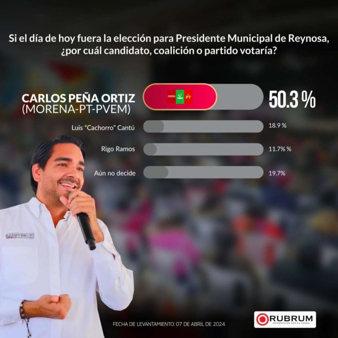 Reynosa, Tamaulipas.-Con 50.3% en preferencia de voto Carlos Peña Ortiz es el favorito para contender por la Presidencia Municipal de Reynosa de cuerdo a la Casa encuestadora RUBRUM.