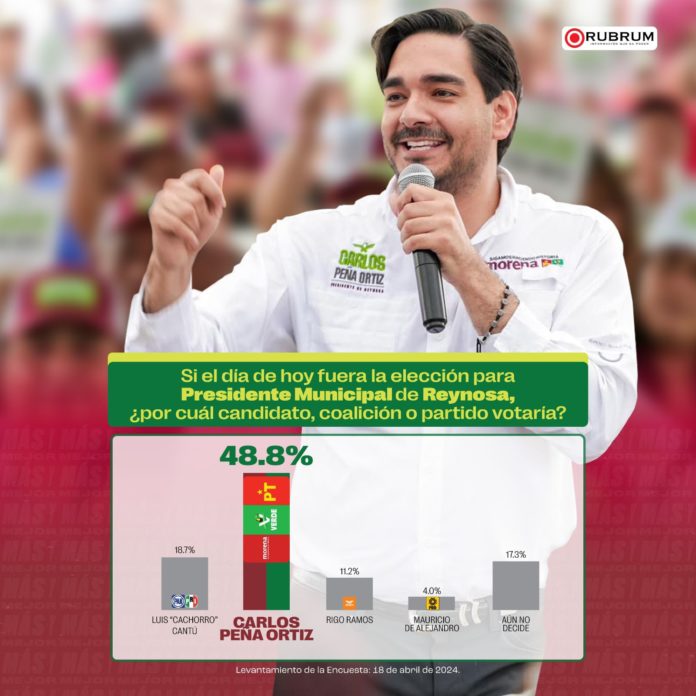 El candidato de la coalición Sigamos Haciendo Historia, Carlos Peña Ortiz, cuanta con un respaldo ciudadano del 48.8% en su camino a la reelección como Presidente Municipal de Reynosa revela la encuestadora RUBRUM, de acuerdo a un sondeo realizado el pasado 18 de abril.