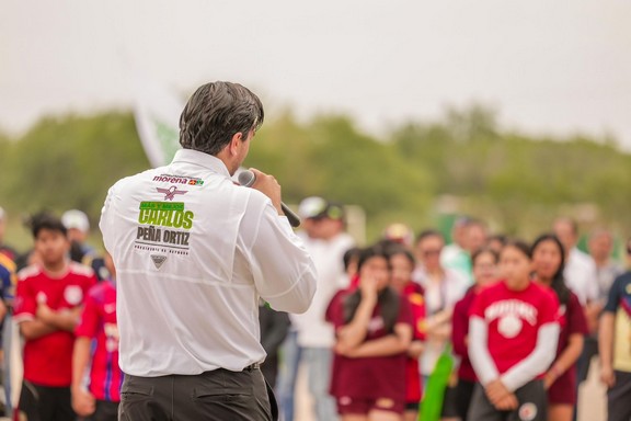 El candidato de Morena a la reelección por la Presidencia Municipal de Reynosa, en alianza con el PT y el Verde Ecologista de México, Carlos Peña Ortiz, se sumergió en el corazón de la acción deportiva al reunirse con entusiastas del fútbol en la colonia Mitras.