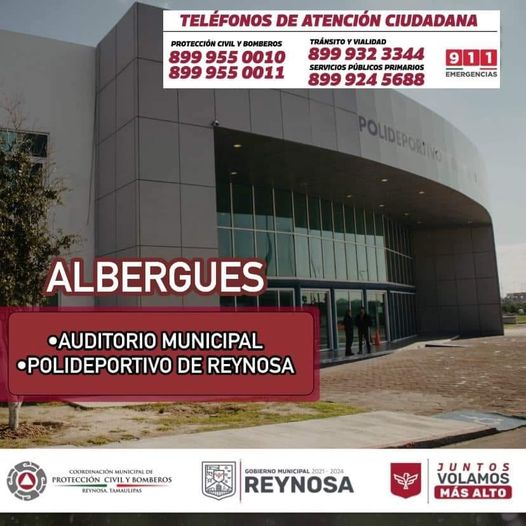 La Coordinación de Protección Civil y Bomberos Reynosa, recomienda que personas que deban abandonar su domicilio por la creciente de agua, acudan al Auditorio Municipal instalado en el bulevar Hidalgo y Avenida Vista Hermosa, así como en el Polideportivo ubicado en Avenida Américo Villarreal en la colonia La Laguna.