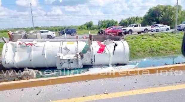 Uno de los accidentes se registro sobre la carretera a Monterrey, a la altura de la colonia Loma Real de Jarachina Sur, donde un tráiler tipo pipa terminara volcado sobre el camellón central con derrame al parecer de diesel, dejando cuantiosos daños materiales, y obstrucción vehicular.