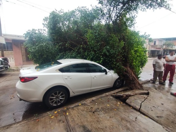 Tampico, Tanaulipas.-Por las lluvias registradas en los últimos días en la zona un árbol se cayó sobre un automóvil estacionado, en la colonia Vergel, afortunadamente no había personas en el interior de la unidad.