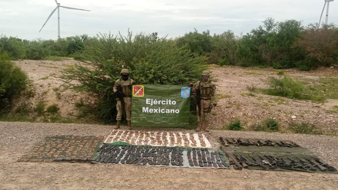 El personal del Ejército Mexicano, mientras realizaba reconocimientos motorizados cerca del parque eólico “Fenicias”, localizó y aseguró un total de 25 armas de fuego, 319 cargadores, 4,046 cartuchos y 17 vehículos. Todos estos elementos fueron puestos a disposición de las autoridades competentes, quienes determinarán la situación legal de los vehículos y las características específicas del armamento confiscado.