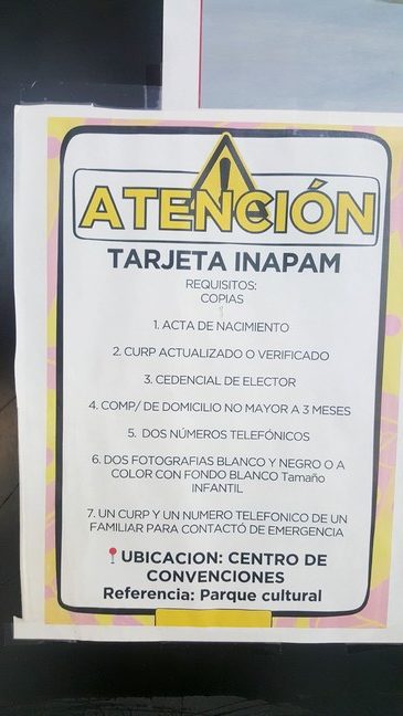 Los requisitos para su tramite los interesados deben de ser mayores de 60 años de edad, o más todos los documentos deberán presentarlos en copia, identificación oficial vigente (INE, Pasaporte, Cartilla, Cedula Profesional), CURP impresa, Acta de Nacimiento legible, comprobante de domicilio (Teléfono, Luz, Gas, Agua) vigencia 3 meses máximo.