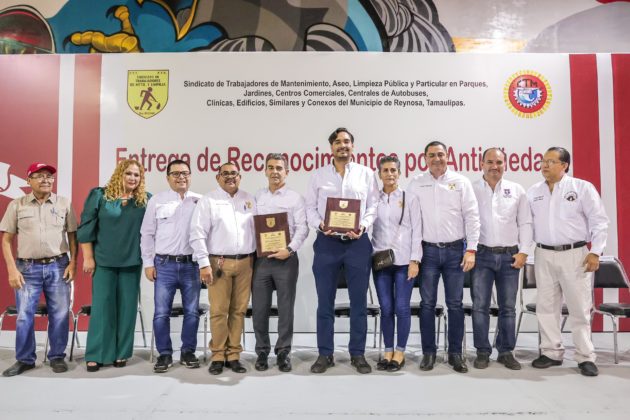 Realzando la celebración, trabajadores del Sindicato recibieron un reconocimiento por su antigüedad con hasta más de 30 años de servicio, y reconocimientos especiales para Rafael Jiménez López ex Secretario General del Sindicato de Mantenimiento y Limpieza; para el Alcalde Carlos Peña Ortiz y para Reynaldo Garza Elizondo.