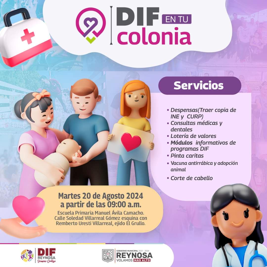 El Sistema para el Desarrollo Integral de la Familia Reynosa que preside Carlos Luis Peña Garza, llevará el programa “DIF en Tu Colonia,” al ejido El Grullo, con una amplia gama de servicios gratuitos.