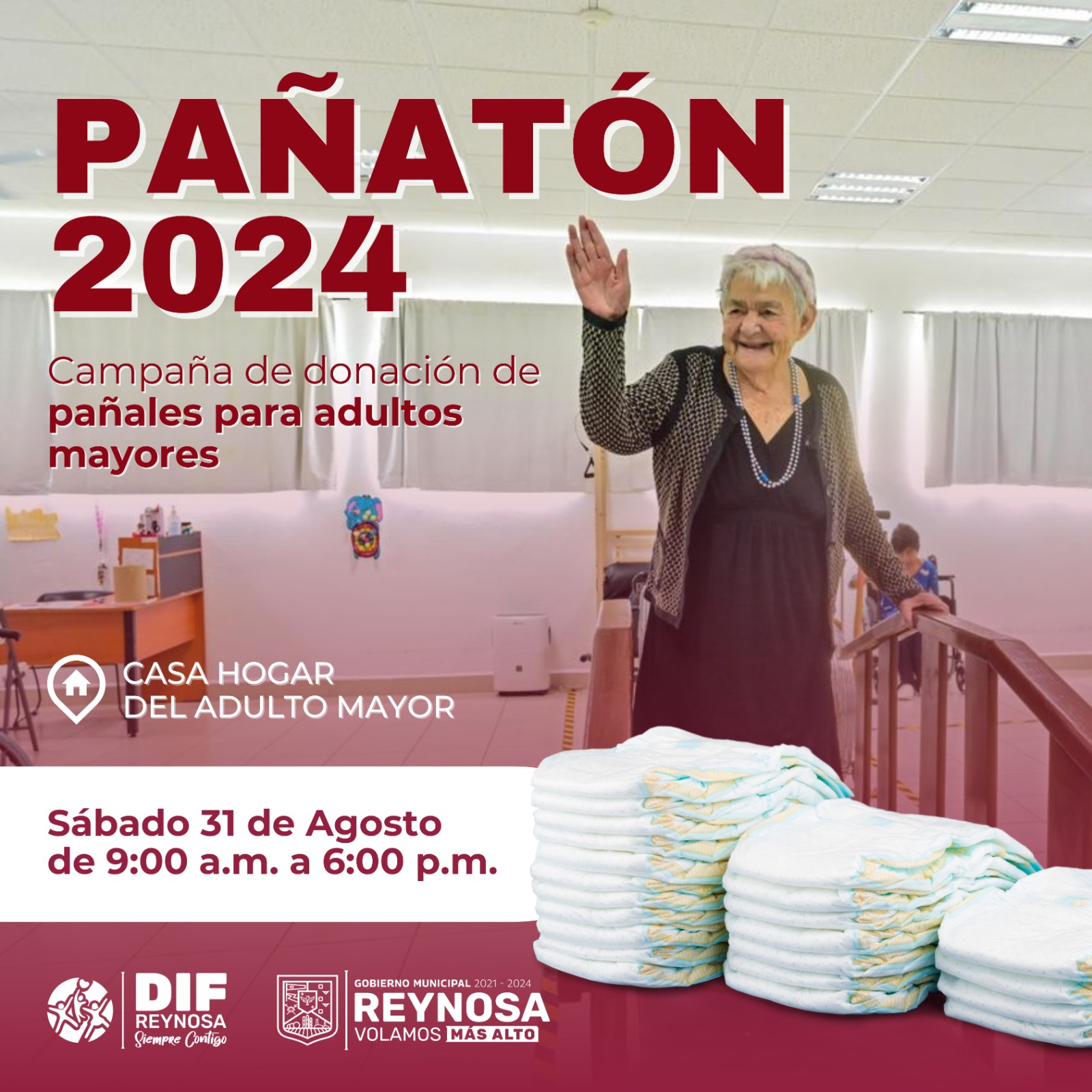 Con el objetivo de dar amor y cariño a los abuelitos de Casa Hogar del Adulto Mayor, el Sistema DIF Reynosa que preside Carlos Luis Peña Garza, hace un llamado a toda la comunidad a unirse al Pañatón 2024, una campaña de donación de pañales que se llevará a cabo el próximo sábado 31 de agosto.