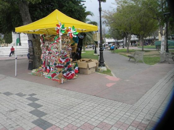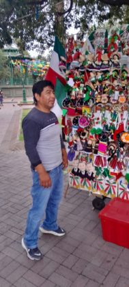 Nuevo Laredo, Tamaulipas.-Juan Manuel Martínez tiene 20 años vendiendo las tradicionales banderitas y adornos con motivos patrios en esta frontera al lado de sus dos hermanos;  ellos se distribuyen en las diferentes plazas públicas  en donde exponen sus productos artesanales que elaboran ellos en su pueblo natal de San Pedro Totoltepec,  Estado de México.