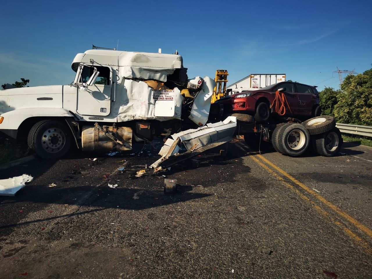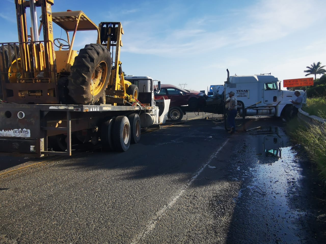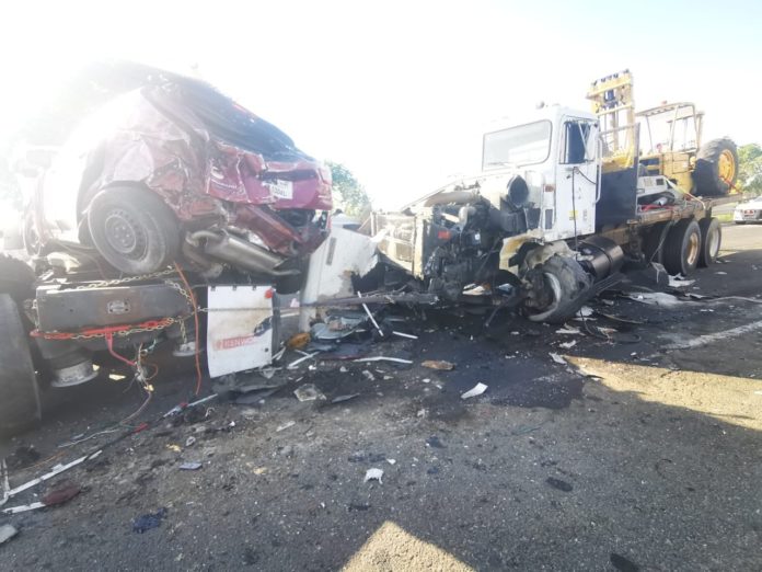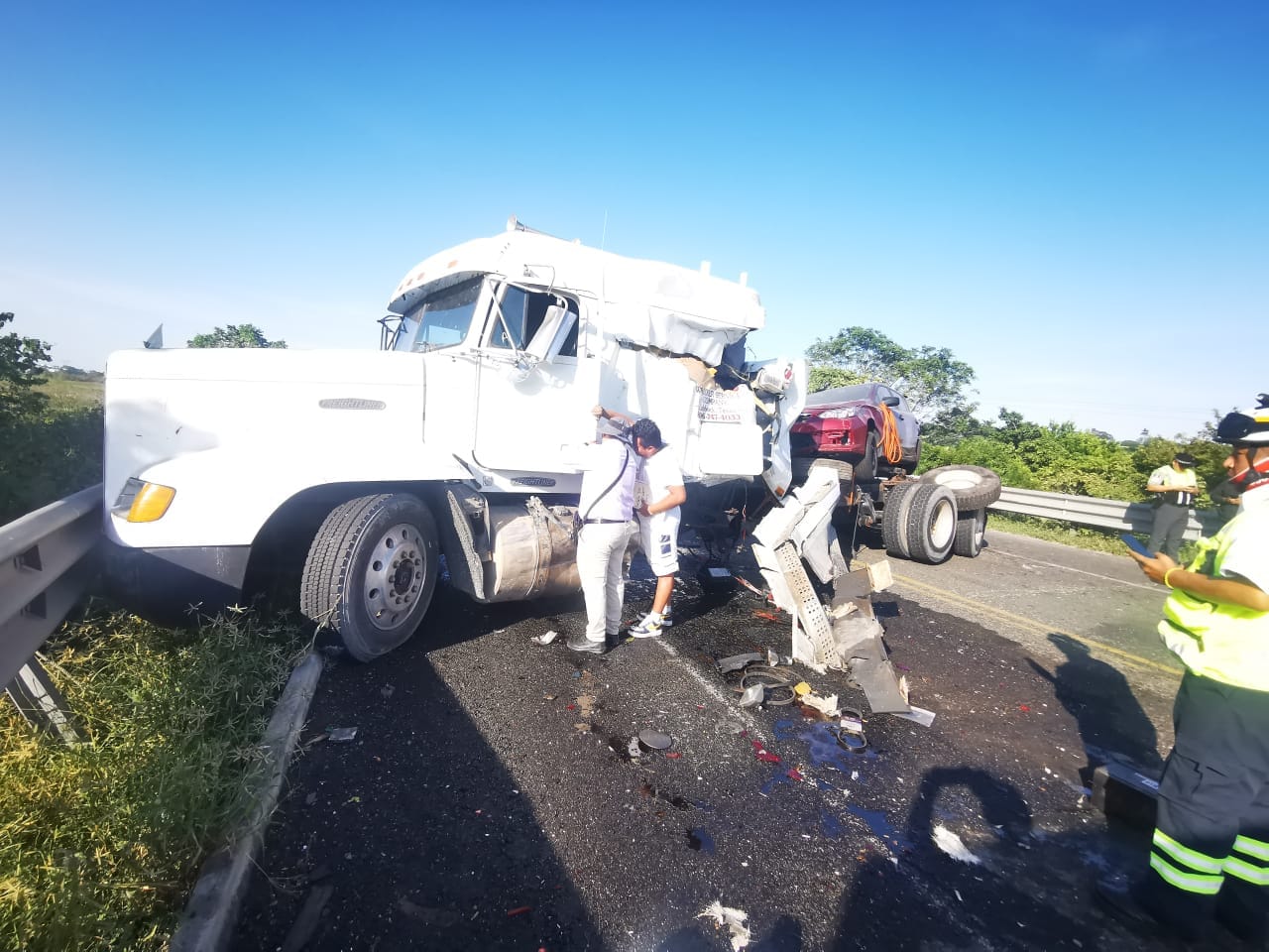 Tampico, Tamaulipas.- Personal de la Guardia Estatal de Apoyo Carretero comisionado a la Estación Segura Moralillo acudió al kilómetro dos de la Carretera Federal 70 para brindar asistencia ante el choque de dos tractocamiones.