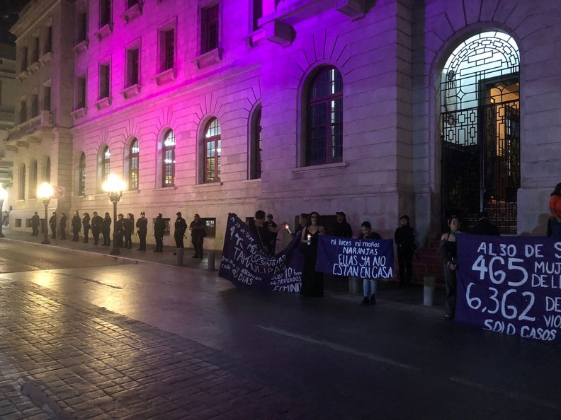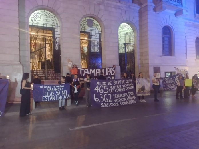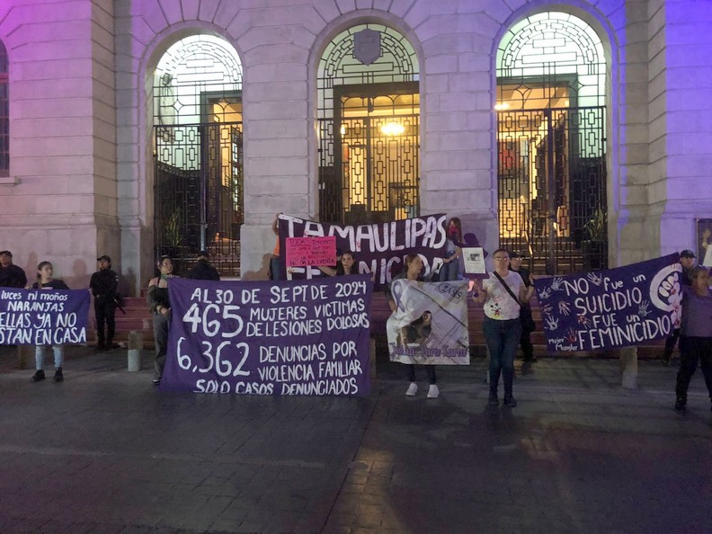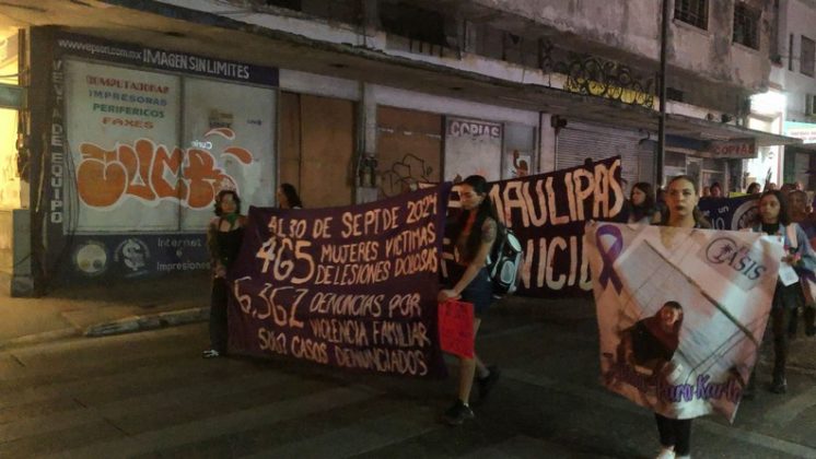 Con pancartas color morado, en donde se leía: Al “30 de septiembre de 2024 146 mujeres asesinadas en Tamaulipas, una mujer es asesinada cada dos días, solo 10 han sido tipificados como feminicidio”, “Al 30 de septiembre de 2024 465 mujeres víctimas de lesiones dolosas, 6, 362 denuncias por violencia familiar, solo casos denunciados”.