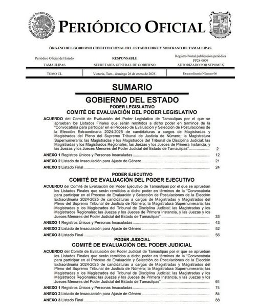 Dichos listados corresponden a la convocatoria del “Proceso de Evaluación y Selección de Postulaciones de la Elección Extraordinaria 2024-2025” para cargos como: Magistradas y Magistrados del Pleno del Supremo Tribunal de Justicia de Número; Magistratura Supernumeraria; Magistradas y Magistrados del Tribunal de Disciplina Judicial; Magistradas y Magistrados Regionales; Juezas y Jueces de Primera Instancia y, Juezas y Jueces Menores del Poder Judicial del Estado de Tamaulipas.