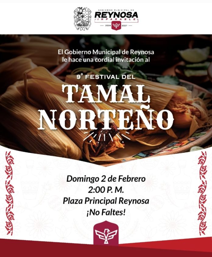 El Presidente Municipal Carlos Peña Ortiz extiende la invitación a todas las familias de Reynosa y del Valle del Sur de Texas a que disfruten el Noveno Festival del Tamal Norteño 2025, este domingo 2 de febrero en la plaza principal Miguel Hidalgo a partir de las 2:00 P. M.