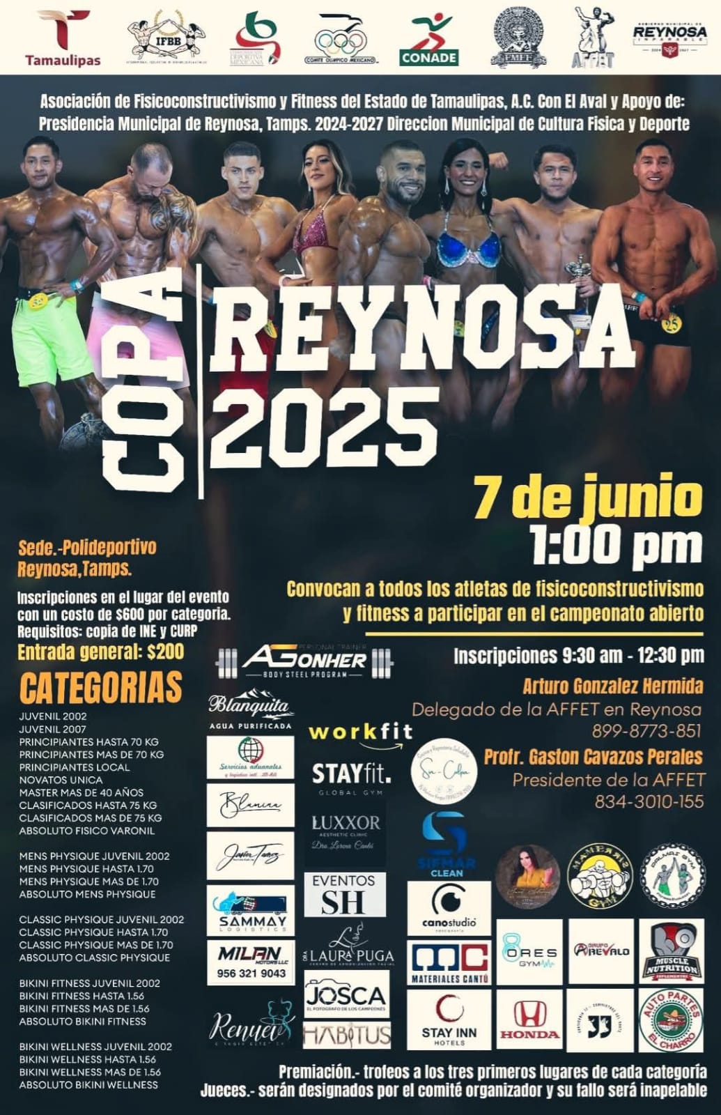 El Alcalde Carlos Peña Ortiz, invita los atletas de Fisiconstructivismo y fitness a participar en la Copa Reynosa 2025, que se llevará a cabo este sábado 7 de junio a la 1:00 P. M. en las instalaciones del Polideportivo, que contará con jueces certificados designados por el Comité Organizador y la Asociación de Fisiconstructivismo y Fitness del Estado de Tamaulipas.