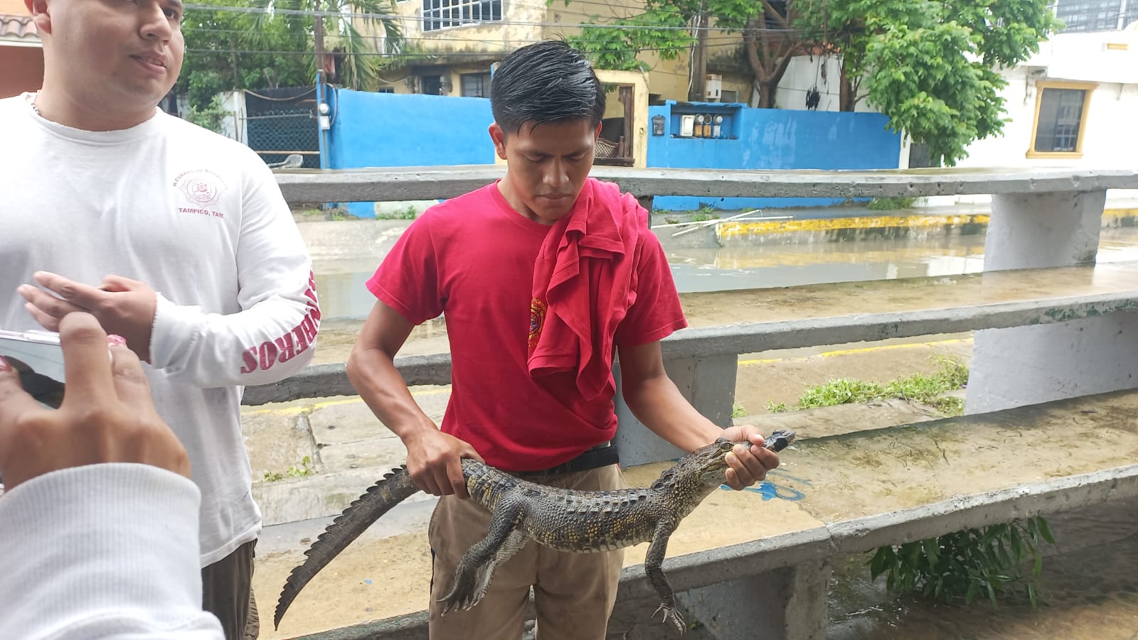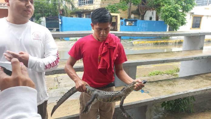 Tampico, Tamaulipas. -Este viernes al medio día al caminar por la calle Democracia, de la colonia Frente Democrático don José Francisco Medrano residente de la colonia Tampico-Altamira de la urbe industrial, atrapó un pequeño cocodrilo. A unos metros del cuartel de Bomberos en Tampico.