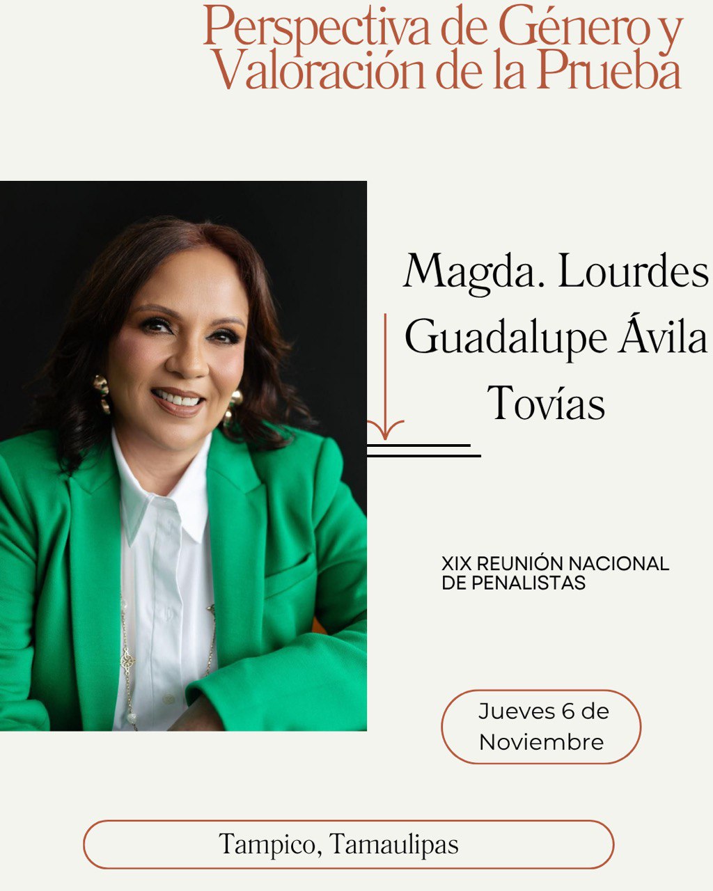 Ciudad Victoria, Tamaulipas.-Tampico será sede de la XIX Reunión Nacional de Penalistas en la UAT Campus Sur, en el magno evento del derecho penal en México, temas como la perspectiva de género, tendrá voz en la magistrada Lourdes Guadalupe Avila Tovias, avalada por una amplia trayectoria profesional, así como un compromiso social en general y con las mujeres en lo particular, ella forma parte del magno evento con la conferencia “Perspectiva de género y valoración de la prueba.