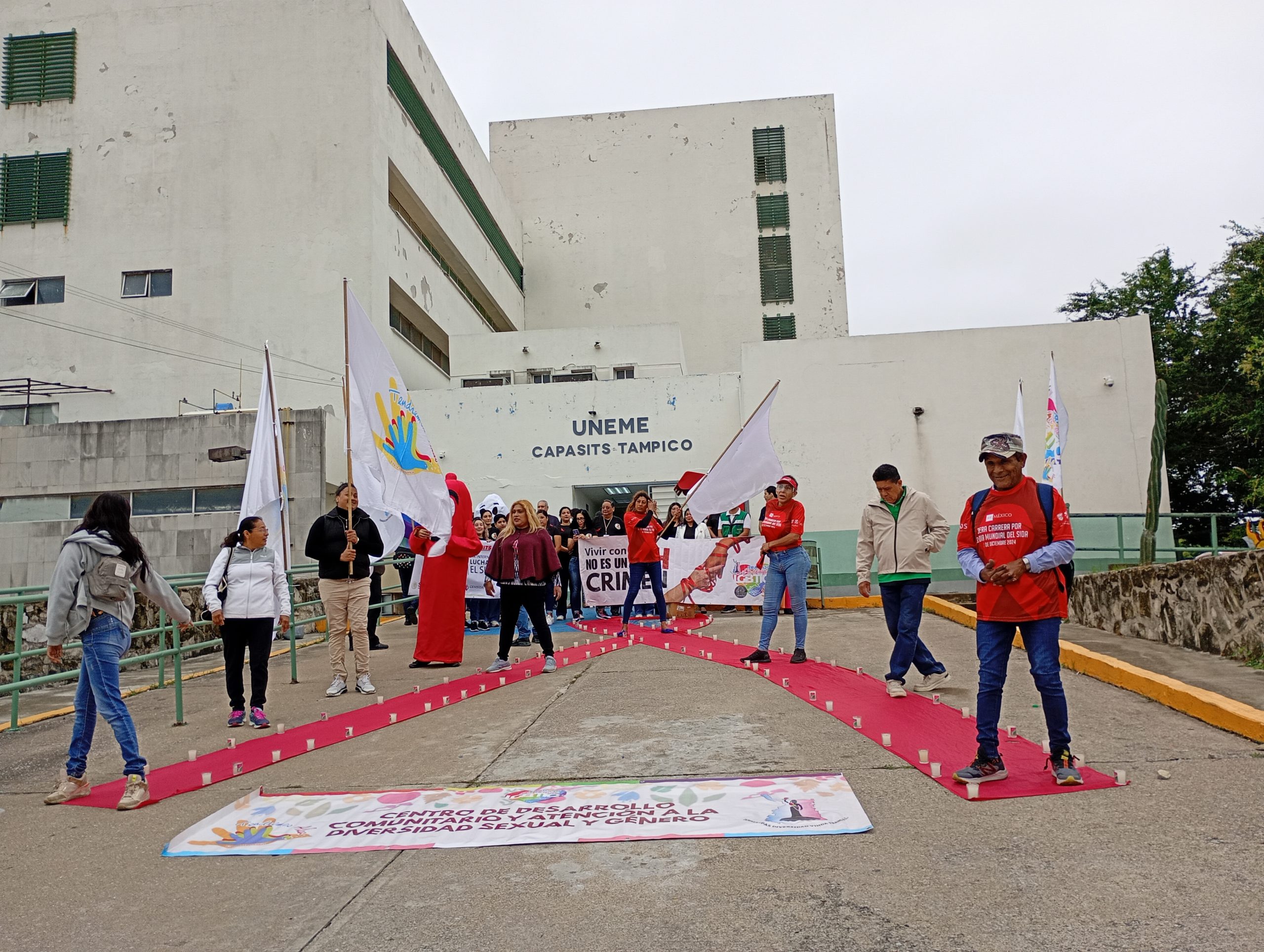 Tampico, Tamaulipas. –Eliminar la discriminación y el estigma hacia quienes viven con VIH/Sida se pidió este 1 de diciembre en el exterior del CAPASITS Tampico, en donde se reunieron integrantes de Tamaulipas Diversidad Vihda Trans y Tendremos Alas A.C, autoridades del sector Salud y del Centro Ambulatorio para la Prevención y Atención al SIDA e Infecciones de Transmisión Sexual.