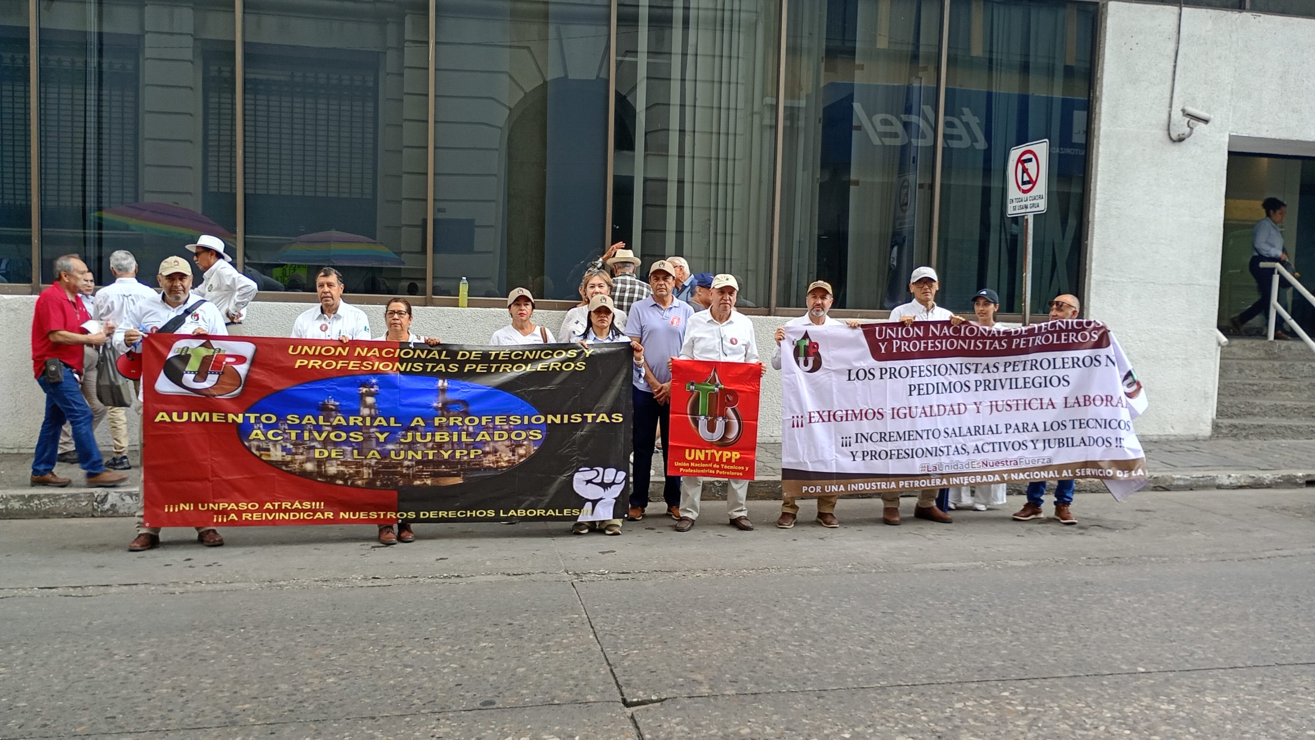 Tampico, Tamaulipas. -Para exigir se les otorgue el retroactivo de su incremento salarial de 4.5 %, como sus demás compañeros, integrantes de Unión Nacional de Técnicos y Profesionistas Petroleros se manifestaron con pancartas en mano, primero en la plaza de Armas de Tampico y después en el exterior de una de las cuatro gerencias regionales de Petróleos Mexicanos, ubicada en la calle César López de Lara.