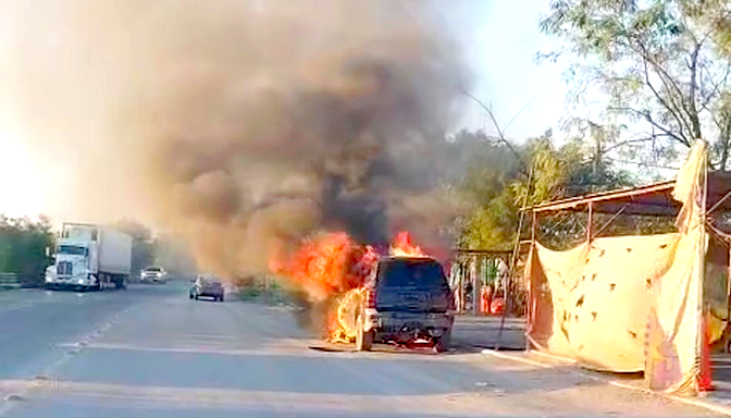 Reynosa, Tamaulipas.-Unidades de bomberos acudieron a un apartado sector de la ciudad para sofocar las llamas de una unidad, y que dejara daños materiales, asi como contaminación ambiental.