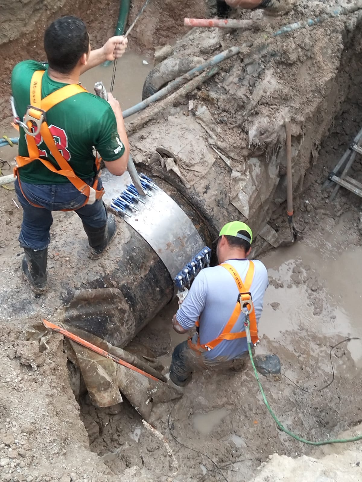 Durante estas acciones, personal operativo del organismo realizó maniobras para la instalación de una abrazadera especial de 36 pulgadas de diámetro, con el objetivo de contener la fuga, evitar el desperdicio del vital líquido y mejorar el funcionamiento de la red de distribución en este sector de la ciudad.