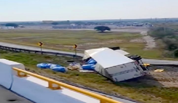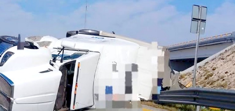 Reynosa, Tamaulipas.-Aparatoso accidente vial se registro en una apartada carretera hacia el oriente de la ciudad, donde un tráiler terminara volcado, dejando daños materiales, y obstrucción vehicular.