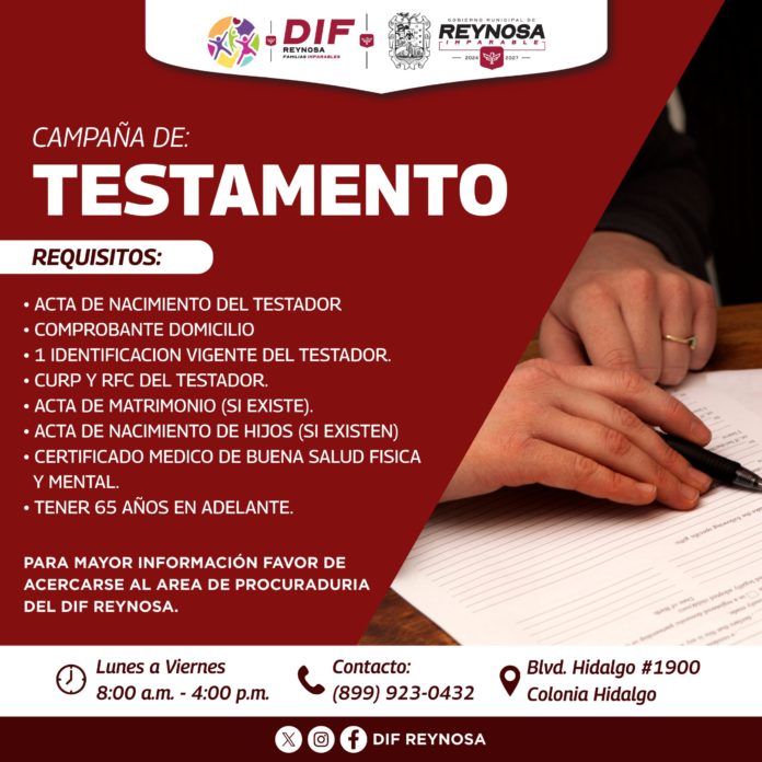 El Sistema DIF-Reynosa que preside Carlos Luis Peña Garza, a través del Voluntariado que encabeza Alejandra Yelitza Garza, amplía la Campaña de Testamentos Gratuitos, a fin de brindar certeza jurídica y tranquilidad a las familias, al prevenir conflictos y garantizar el cumplimiento de su voluntad.